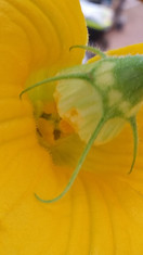 Our two sturdy little plants took off growing and quickly took over the trelis. They grew, and grew, and grew but didn't flower. I worried that maybe I had given them too much fertilizer, favoring leafy growth over reproduction. Looking online, I learned that they are day-length sensitive. They won't flower nor fruit until the day length is less than 14 hours. Finally, one day I saw a yellow flower with a base like a pineapple -- a baby horned melon! I hadn't seen any male flowers. This was two weeks after our days shortened to less than 14 hours. I examined the vine and found many very tiny melons forming. We searched diligently and found a few male flowers, and we've tried to pollinate several blooms. We definitely won't get to all of them (they are much smaller and harder to pollinate than the squash blossoms, and much more prolific), but the insects are doing ok on some of our other plants, so we'll hope for their help.
