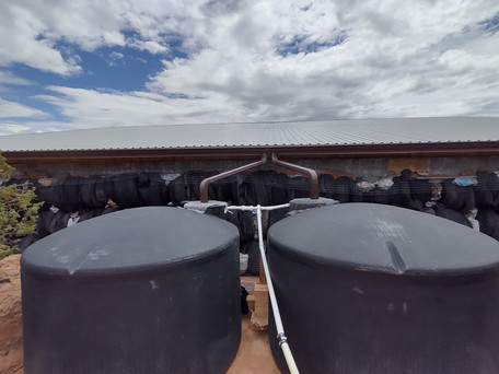 With the drainage taken care of, we still had to connect the roof with the rainwater tanks. We had rain in the forecast, and found TG Orr Enterprises in Gallup, who could get out within the week and install a one-piece seamless gutter, with downspouts into our tanks. We jumped at that, and it went up, easy as could be! We also had to install the shut-off valves at the bottom of the tank so we'd have a way to plumb the house intake.